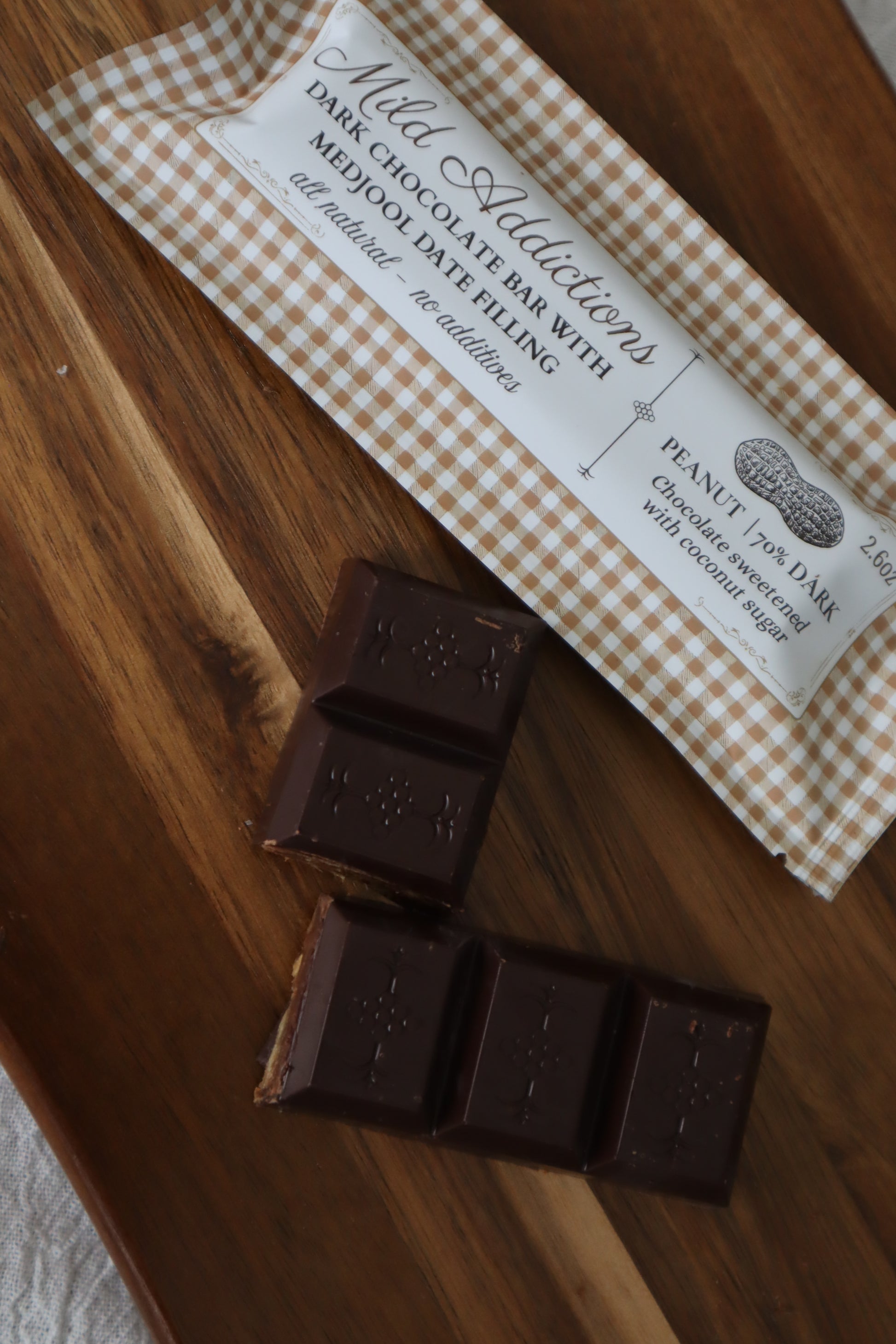 Our Mini Dark Chocolate Bar with Peanut Butter & Medjool Date Center packs all the flavor of your favorite combo—house-ground organic peanut butter, chewy Medjool dates, and rich 70% dark chocolate—into a convenient, snackable size.